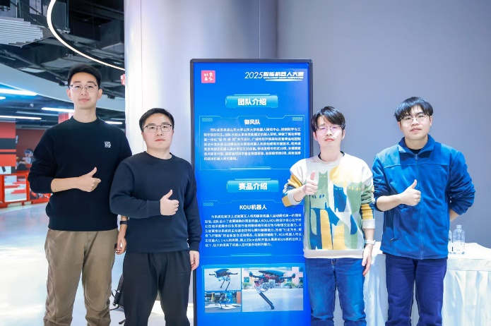 山东大学机器人中心御风队凭借作品“旋翼辅助腿足机器人KOU”(图1)在创新类赛道中获评创新能力优秀团队,团队由机器人中心研究生朱玮良、曾显武、秦道岭、谯立超、鲁一川组成(图2)。该项目开创性地深度融合仿生双足行走的精细地形适应性与物理交互潜力,以及旋翼推进系统的主动姿态控制与瞬时越障能力,形成“行走为主,按需飞行辅助”的全新复合运动模态,可以实现旋翼辅助跳跃、80cm高的台阶跳下等任务,极大的提高了机器人应对复杂地形的能力。
